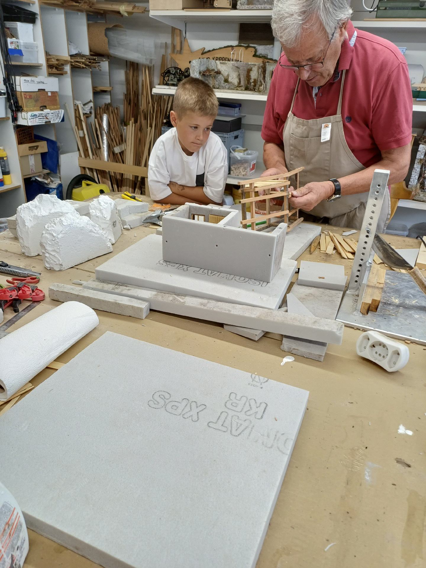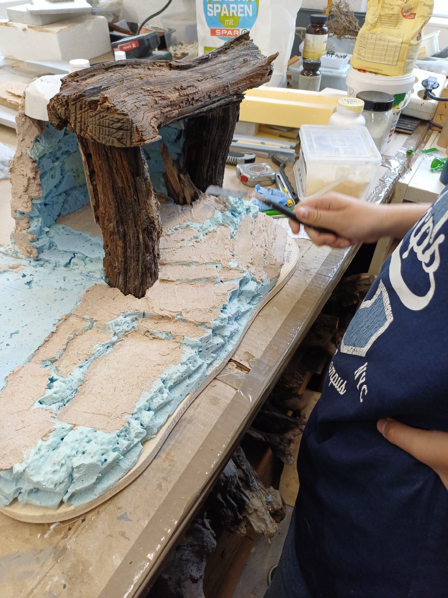 Dann fertigten wir zusammen mit Sepp Krabb den Krippenmörtel an, um die Höhle und einen Teil der Landschaft zu vermörteln.