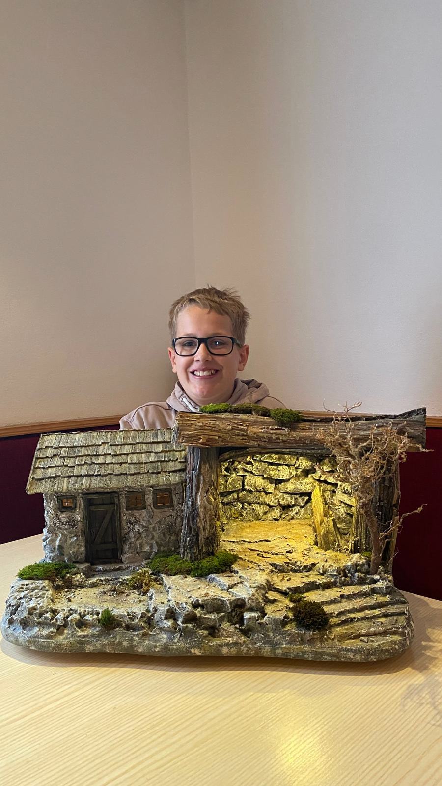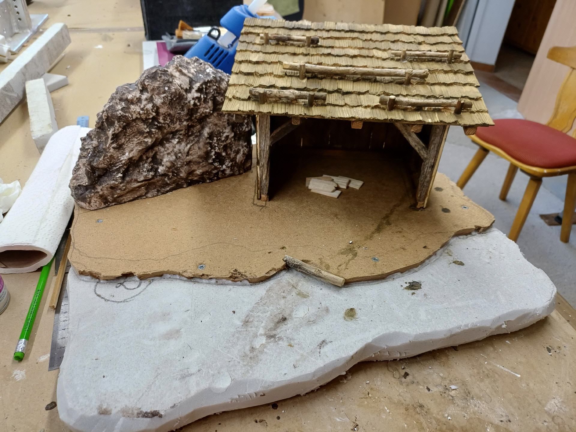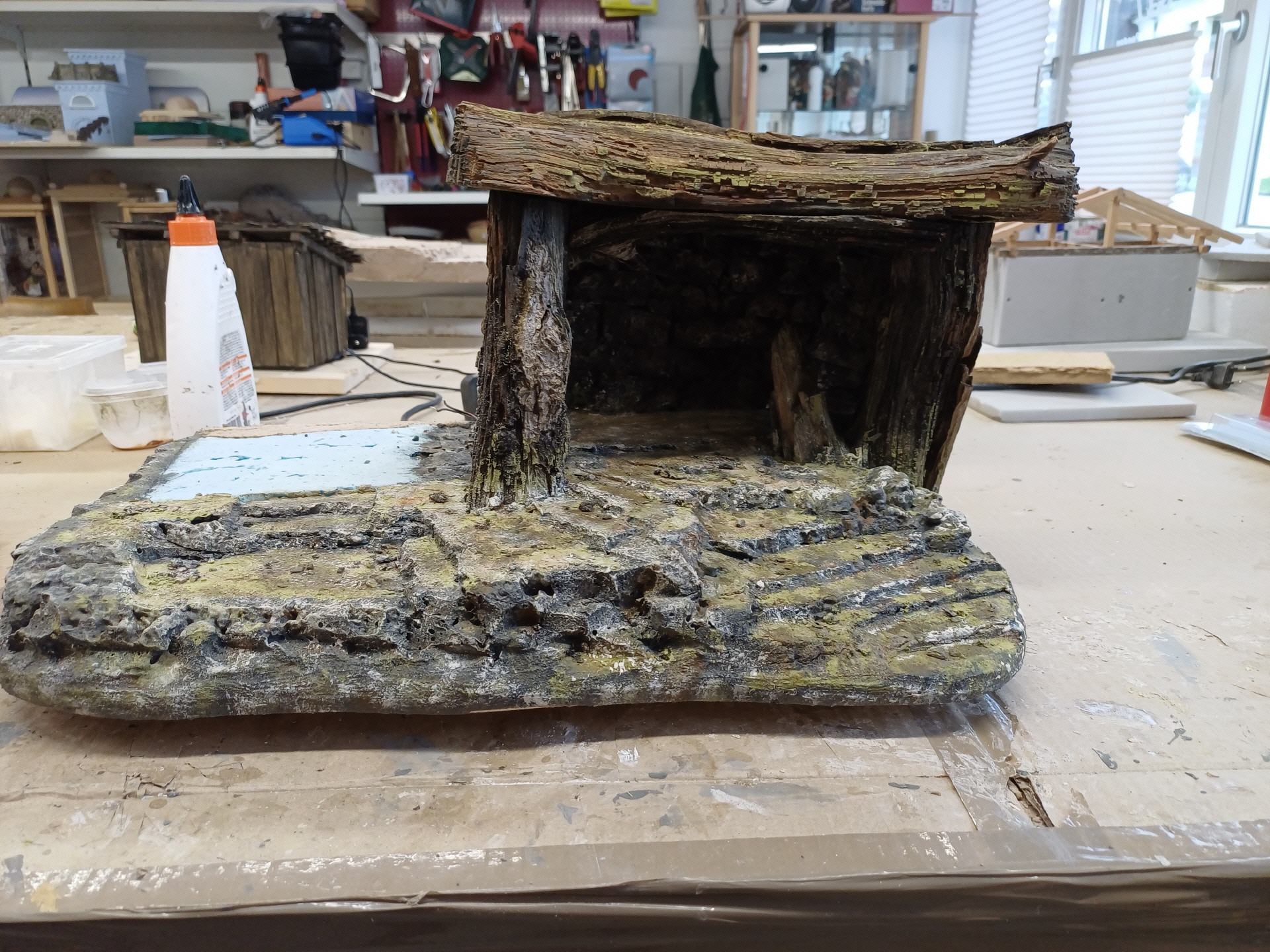 Er führte uns zu zwei vorgefertigten Krippengerüsten. Eine Orientalischen und einer Alpenländischen. Die anderen Jugendlichten machten Alpenländische Krippen. Sogleich fingen wir an, das Haus mit Steinen zu verzieren und die Höhle zu bauen, in der dann die Figuren kamen. Alle Krippen wurden im Maßstab zu den Figuren gebaut (8cm).