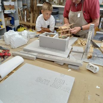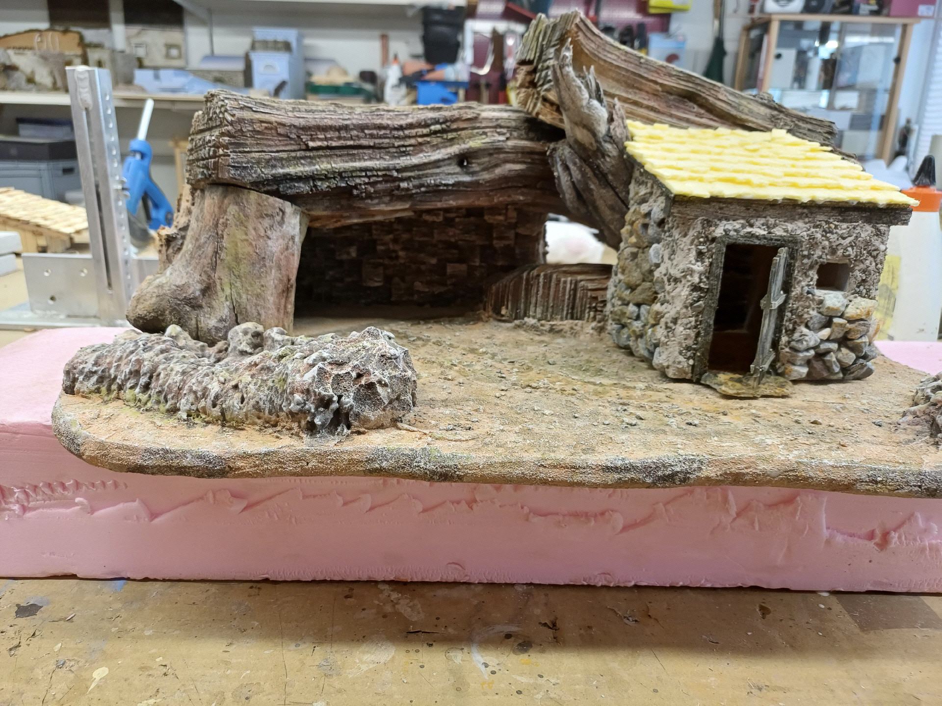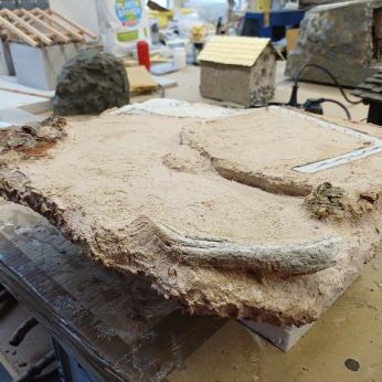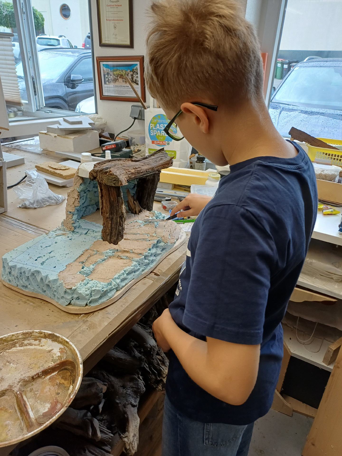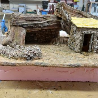 Am zweiten Tag grundierten wir die Landschaft und die Höhle. Danach vemörtelten wir das Haus mit einem speziellen Mörtel, da wir Risse in den Hauswänden brauchten. An Tag drei waren wir ganz überrascht, wie schön detailliert unsere Krippen über Nacht bemalt wurden. Auch die anderen wurden schön langsam mit ihren Krippen fertig.